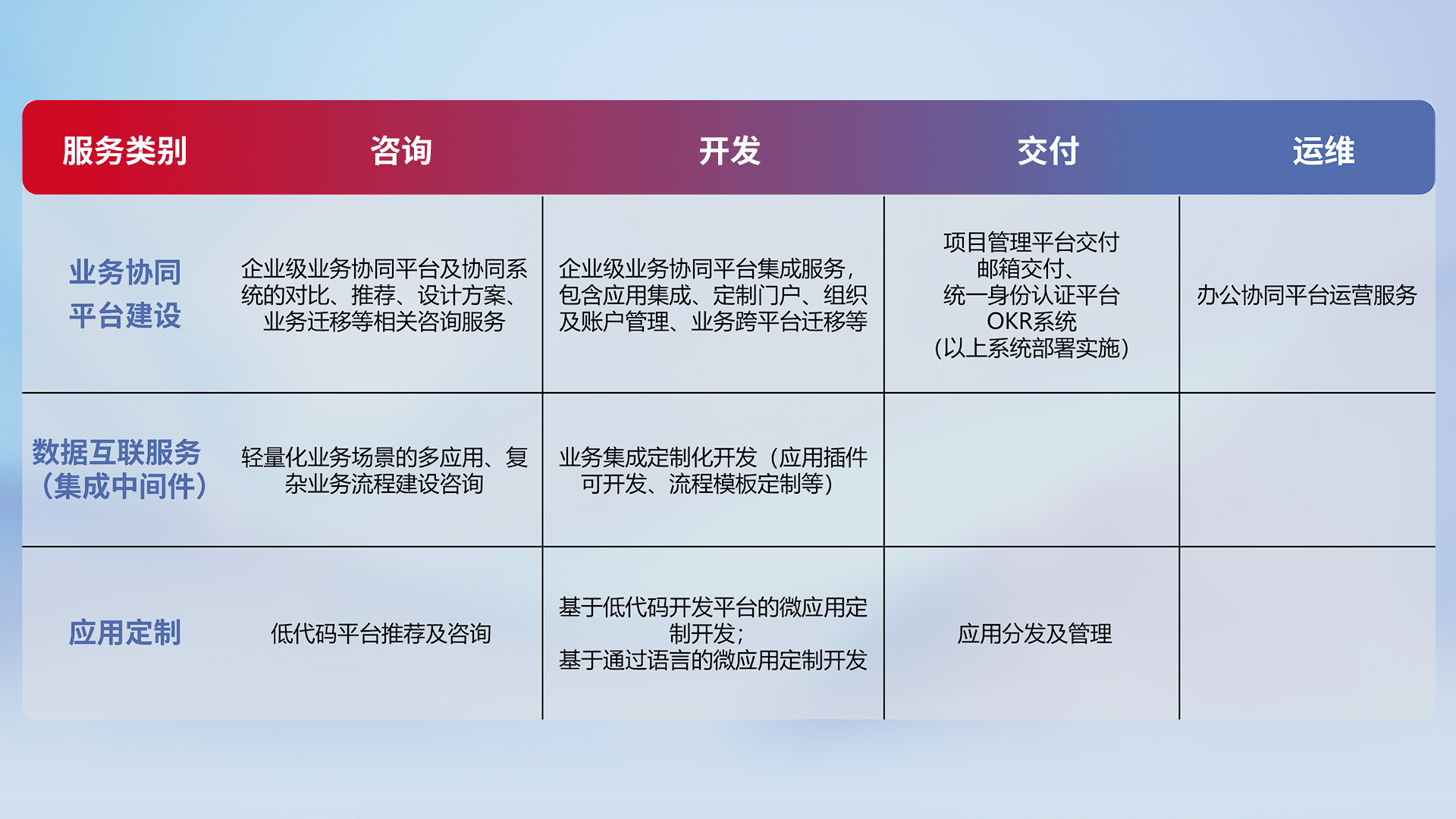 针对钉钉、、、、企微、、、、IDaas等平台级产品提供产品的规划、、方案、、、、交付、、定制化开发等服务,,,,实现如统一协同办公、、、智能客户服务、、、、混合会议管理、、智能数据查询、、等业务场景,,,,实现数字化转型。。。。