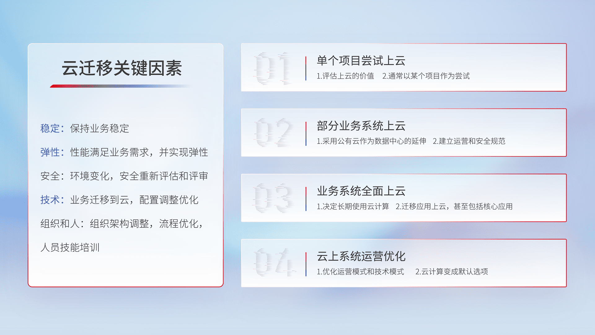 结合实际业务,,从规划设计、、、、云平台选型、、、、云原生改造、、、、数据迁移、、、、集成交付,,,,迁移全过程为客户识别最佳上云路径,,,,做好风险识别管理,,,,设计网络架构、、、、身份权限、、、安全审计合规、、、、操作审计、、日志审计、、、监控告警策略、、、、多站点容灾设计等,,,对云上基础设施进行整体规划,,提升IT治理水平,,,以满足弹性、、高可用、、高性能的需求。。。